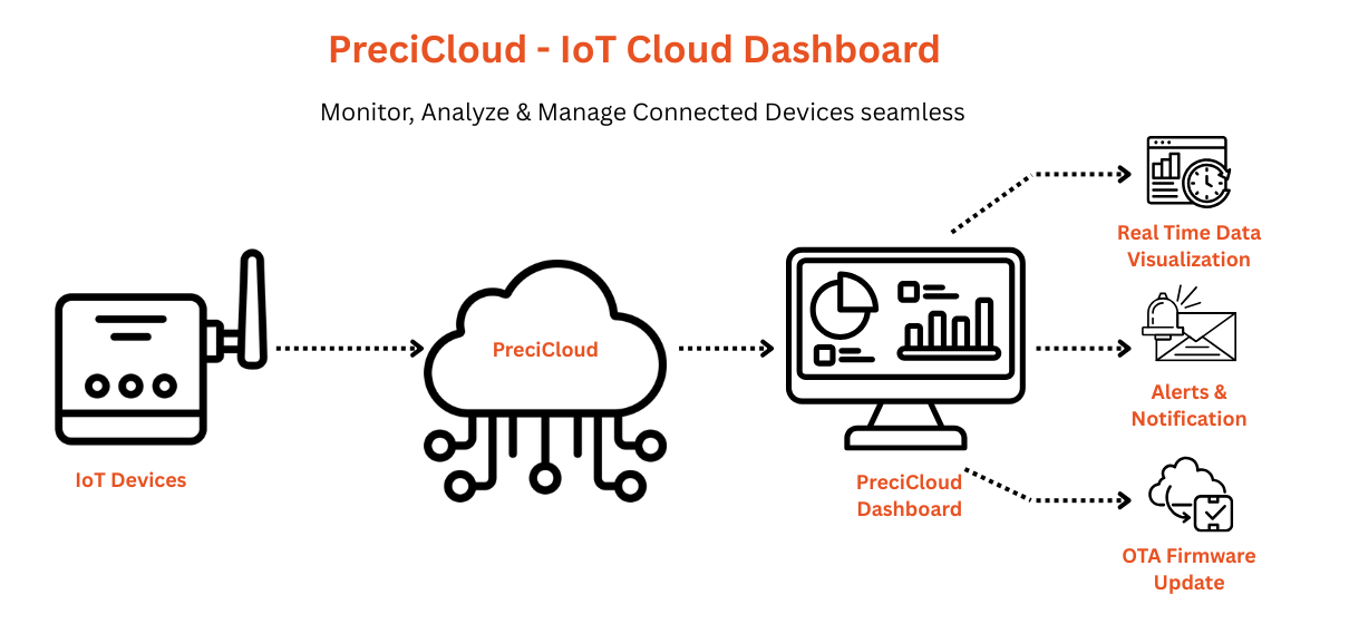 PreciCloud is an intuitive IoT Cloud Dashboard that enables users to monitor, analyze, and manage connected devices seamlessly from anywhere. Designed as a powerful IoT Device Management Platform, it offers centralized control with features like remote configuration, over-the-air firmware upgrades, and intelligent alert handling through email or SMS notifications.