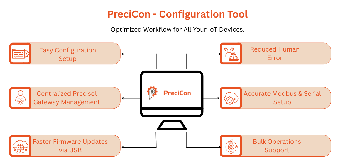 The Precicon Configuration Tool is a user-friendly software used to configure, calibrate, and manage Precicon wireless/IoT gateway devices and connected sensors. It helps users quickly set up device parameters without complex coding.